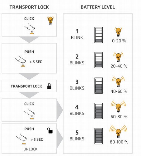 ●輸送ロック中と、ロック解除の際に、バッテリーの残量がわかる機能が追加されました。